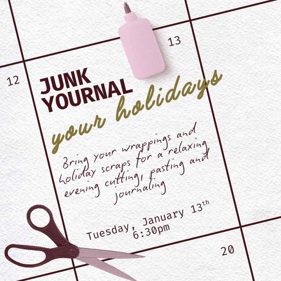 A hands-on evening of junk journaling where you cut, paste, layer, and reflect using holiday scraps and ephemera, bringing your own journal and materials or jumping in with shared supplies provided on-site, with time to experiment, trade scraps, and build messy, personal pages that turn leftover memories into something tactile and lasting