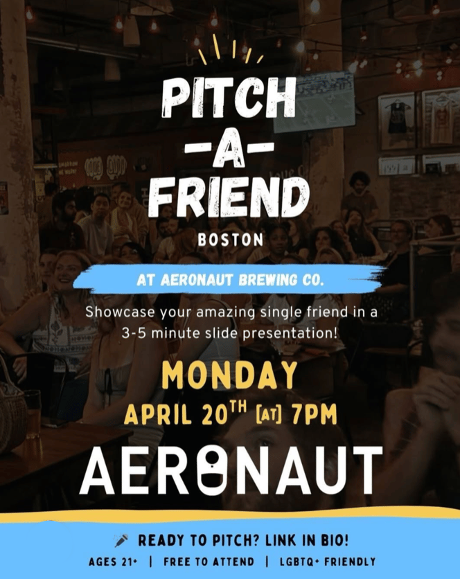 Pitch-A-Friend @ Aeronaut Brewing, Somerville — A part–open mic, part–dating experiment where presenters sell their friends like a startup idea, complete with red flags, highlights, personal lore, and just enough sincerity to make it interesting - pitch submissions are full but you can still attend and get on the on the waitlist