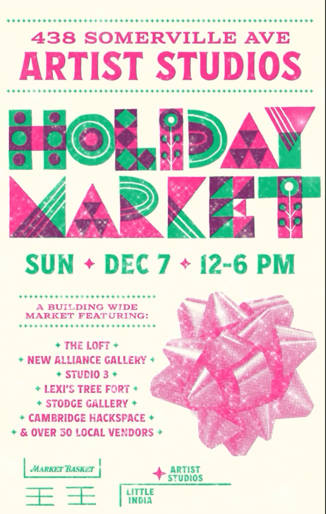 Three floors of local art, vintage, handmade goods and over 50 makers open their quirky studio complex for an indoor holiday market with free wine + seltzer, jazzy holiday music and room-to-room wandering right next to Market Basket