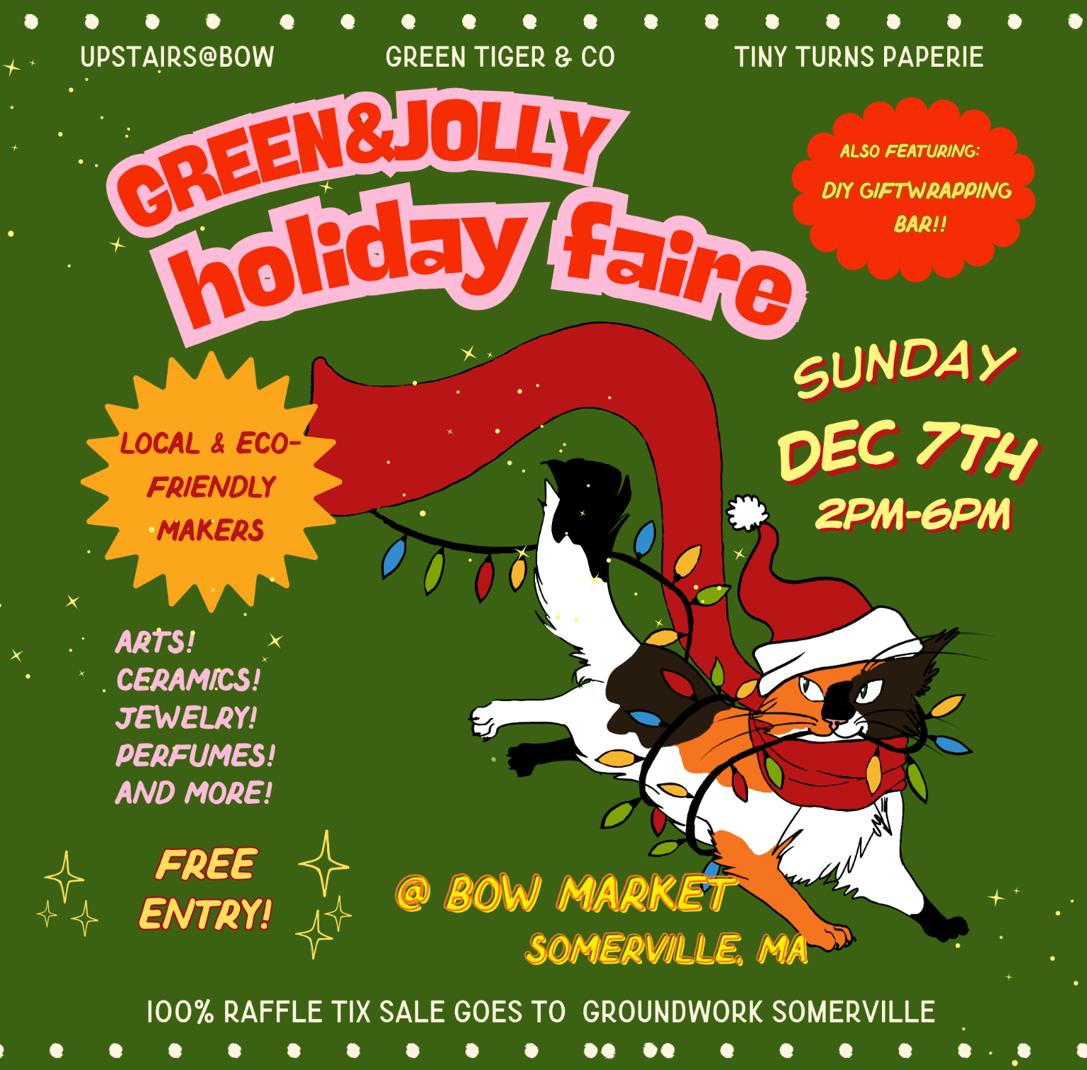 Bow Market turns into an eco-holiday popup as local makers take over the upstairs space with handmade ceramics, upcycled jewelry, perfumes, foraged-wood gifts, and a DIY gift-wrapping bar stocked with recycled papers and stamps — plus raffle prizes benefiting Groundwork Somerville