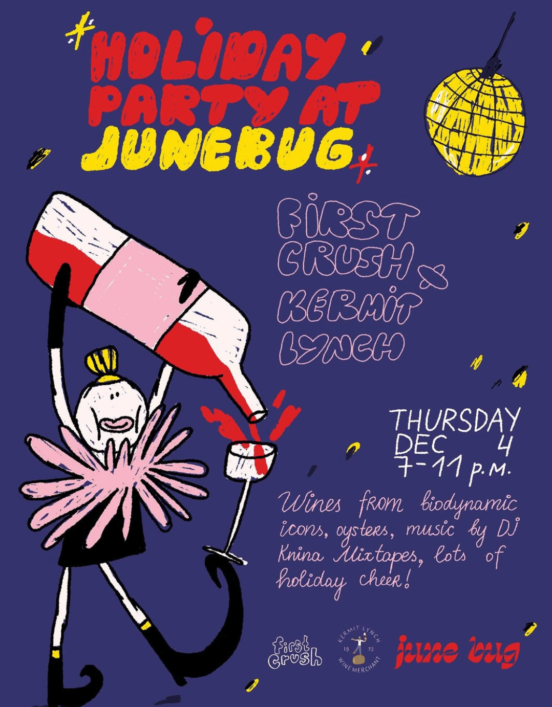 Holiday Wine Party @ June Bug, Somerville – First Crush takes over June Bug for a holiday wine party with natural pours from Kermit Lynch producers, unlimited oysters and pizza, a welcome pour, DJ Knina Mixtapes on the decks and a raffle of standout bottles all night — meet new people and learn about wine | $85, 7–11pm