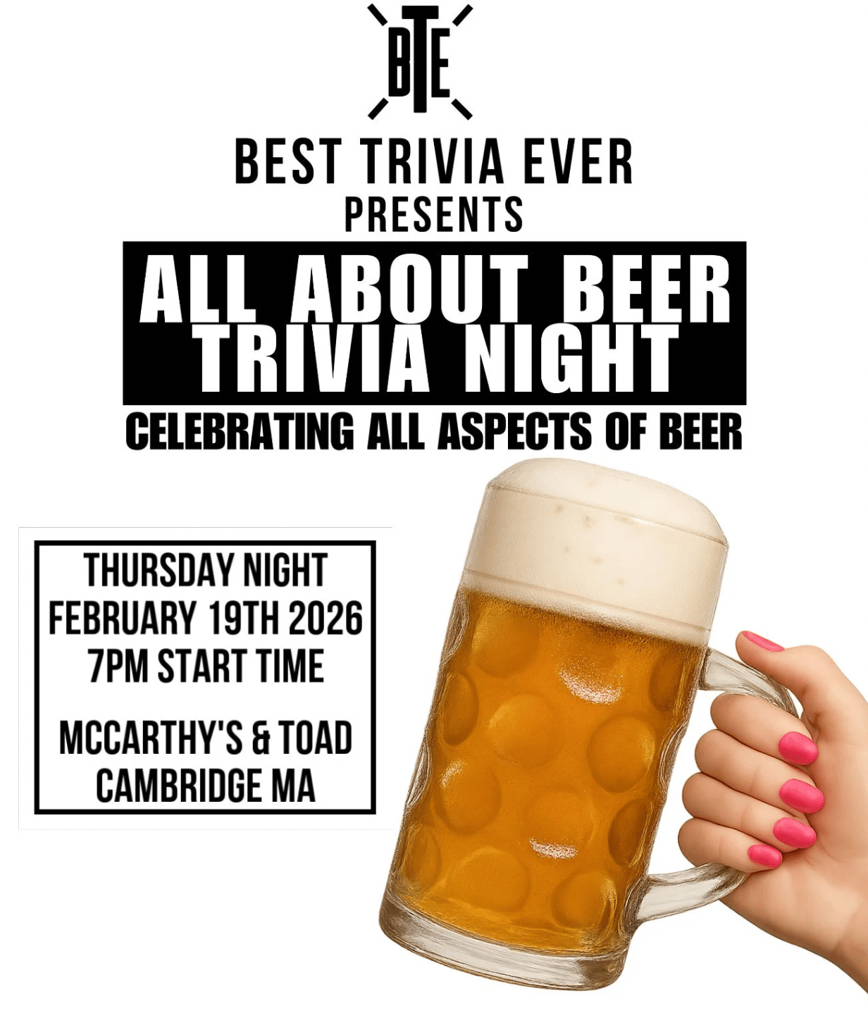 All About Beer Trivia Night @ McCarthy’s & Toad, Cambridge — A specialty trivia event from Best Trivia Ever focused entirely on beer, covering everything from craft brewing and lagers to fun facts and industry history | FREE, 7–9PM