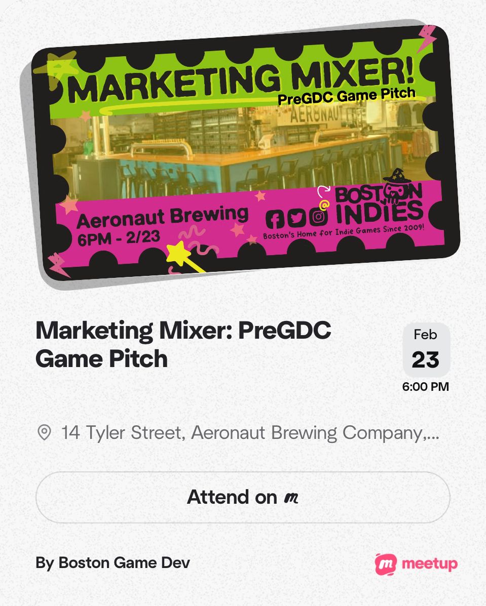 Marketing Mixer: PreGDC Game Pitch @ Aeronaut Brewing, Somerville — A structured pitch night hosted by Boston Game Dev where developers present a polished pitch deck on the big screen, get 15 minutes to sell their concept, and receive live feedback from an expert panel, with focus on market positioning, budget, timeline, and what makes the game stand out