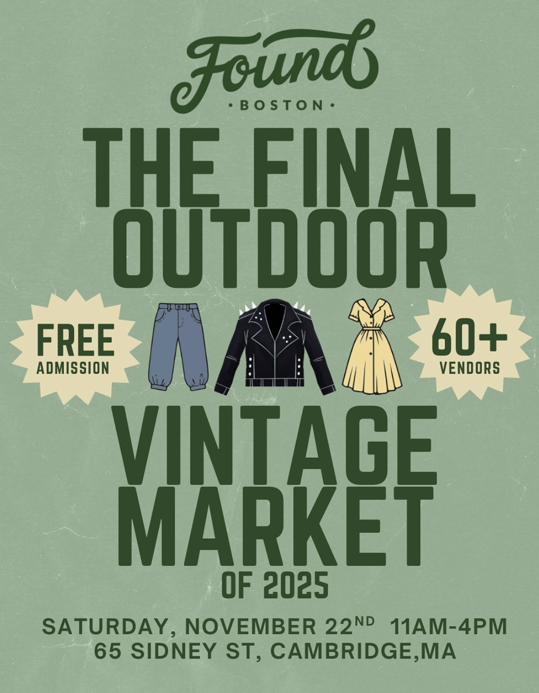 The final outdoor market of the season brings 60+ vintage vendors to University Park, with racks spread across the green, bins to dig through, and plenty of space to browse one last time before the cold sets in; all ages and pets welcome and no entry line or fee