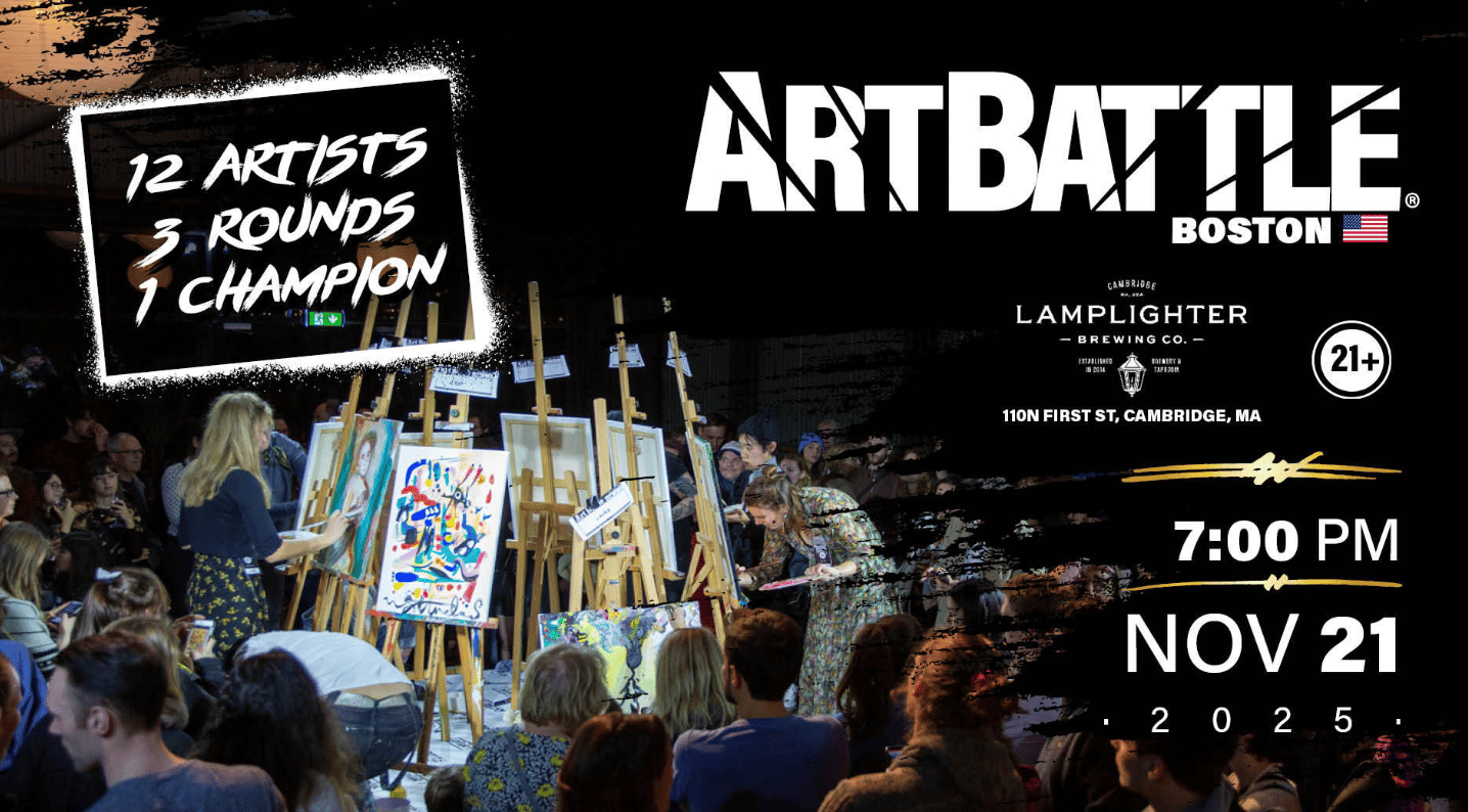 Twelve artists face off in three fast-paced painting rounds as the crowd watches each piece come to life before voting for the night’s champion, with every work going up for silent auction and Lamplighter pouring all evening