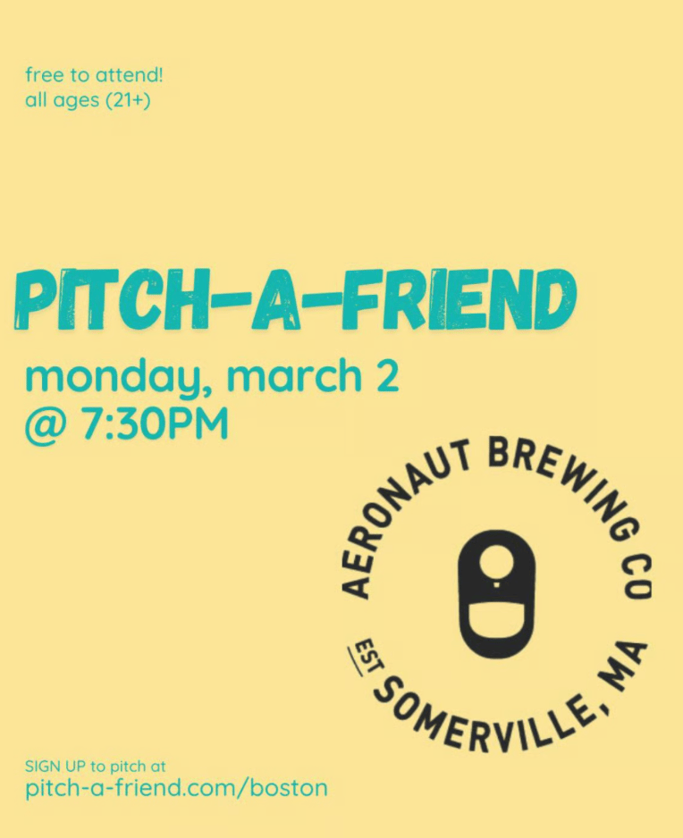 Pitch-A-Friend Boston @ Aeronaut Brewing, Somerville – Ever wished your friends could sell your best qualities for you? At this live matchmaking night, they actually do as they pitch their single pals in quick slides inside Aeronaut’s buzzing taproom; waitlist only for pitches but come watch for free